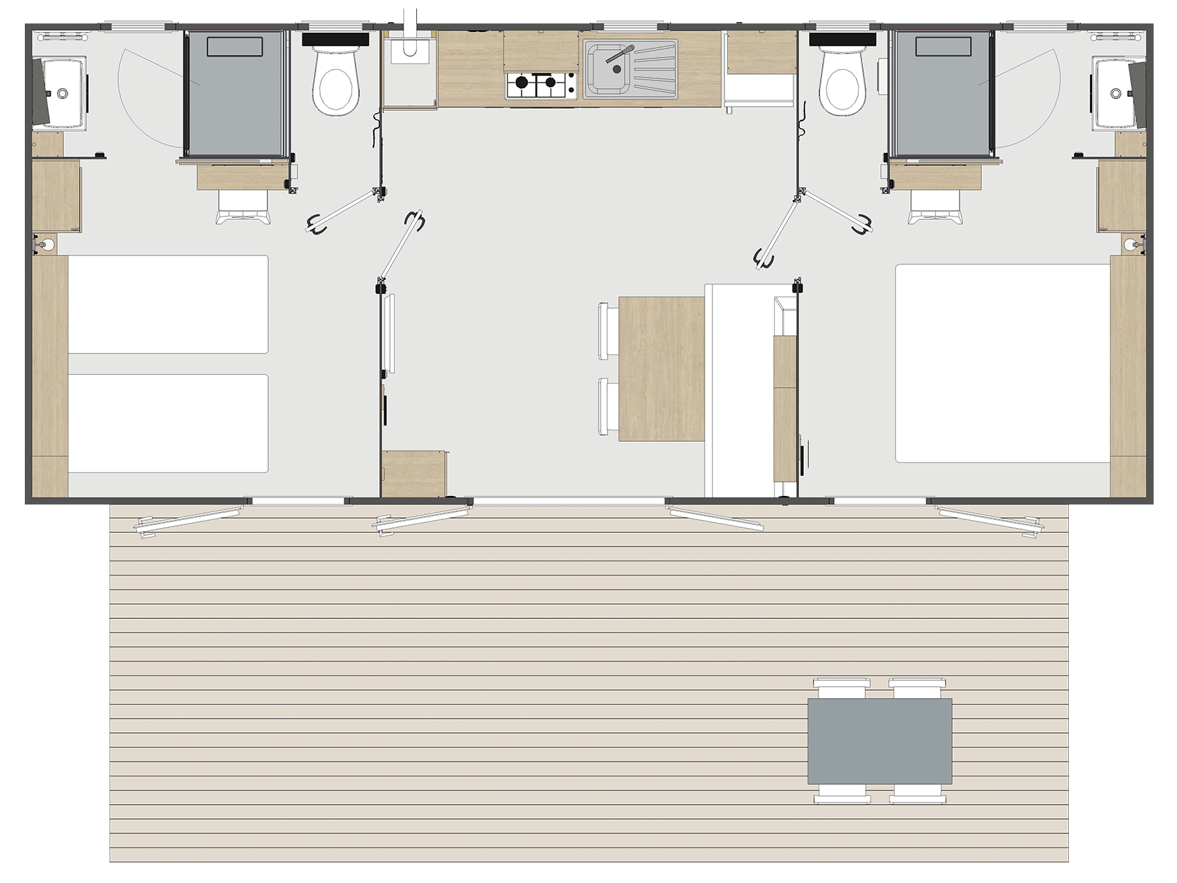 Choose our premium 2-bedroom mobile home for luxury amenities, a welcoming atmosphere and the perfect choice for anyone looking for a comfortable and relaxing stay. With two bedrooms, each with its own private bathroom, this space ensures privacy and convenience. The master bedroom is equipped with a 160 cm bed, ideal for restful nights. The spacious living room opens onto a fully equipped kitchen, making it easy to prepare delicious meals. You will also appreciate the Nespresso coffee machine, perfect for making your favourite coffees at any time of the day. Outside, a large terrace awaits you with a cosy dining area equipped with a plancha grill, offering the perfect place to relax in the sun. This premium mobile home can accommodate up to 4 people, making it the ideal setting for a relaxing break.
